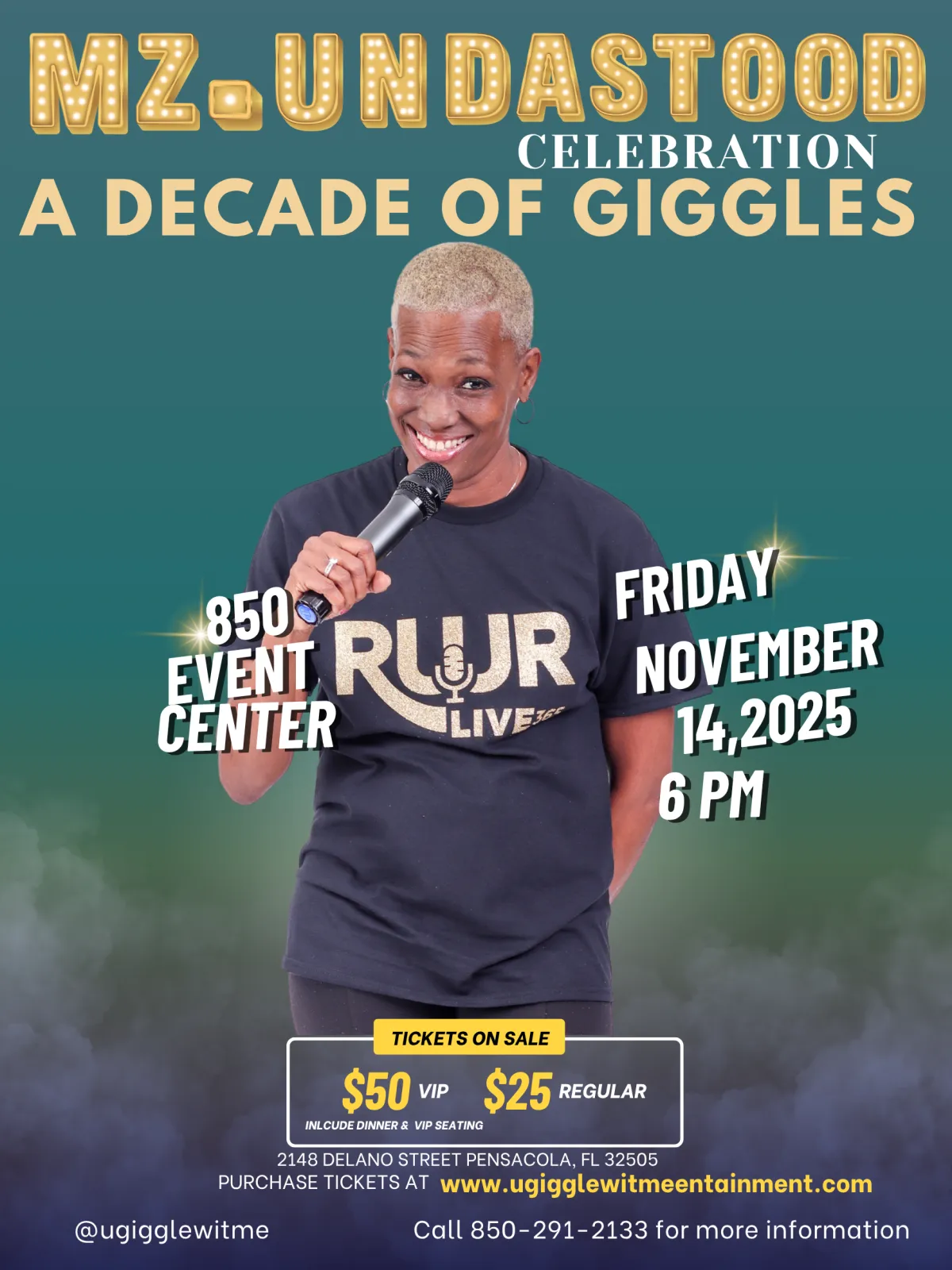 This isn’t just another show — it’s a moment in history. A decade of giggles deserves a front-row seat, and we want you in the room when it all unfolds. Reserve your seat today and be part of the laughter, the legacy, and the live magic of A Mz. Undastood Celebration: A Decade of Giggles.